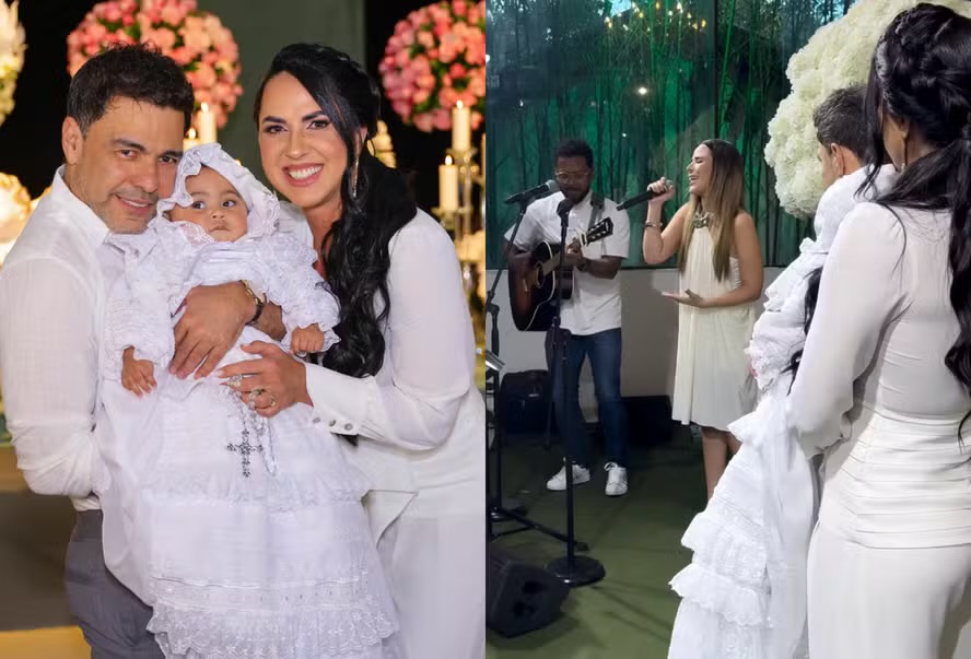Graciele Lacerda, de 44 anos de idade, e Zezé Di Camargo, de 63, celebraram o batizado de Clara DI Camargo, primeira filha do casal, nesta segunda-feira (18). A entrada do trio na cerimônia católica foi embalada por um cover de Bondade de Deus, canção cristã de Isaias Saad, feito por Wanessa Camargo, filha do sertanejo com Zilu Godói.