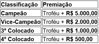 Além dos prêmios por colocação, os Goleiros Campeões e os Artilheiros das duas modalidades (Livre e Master) receberão um bônus de R$ 500,00 cada.