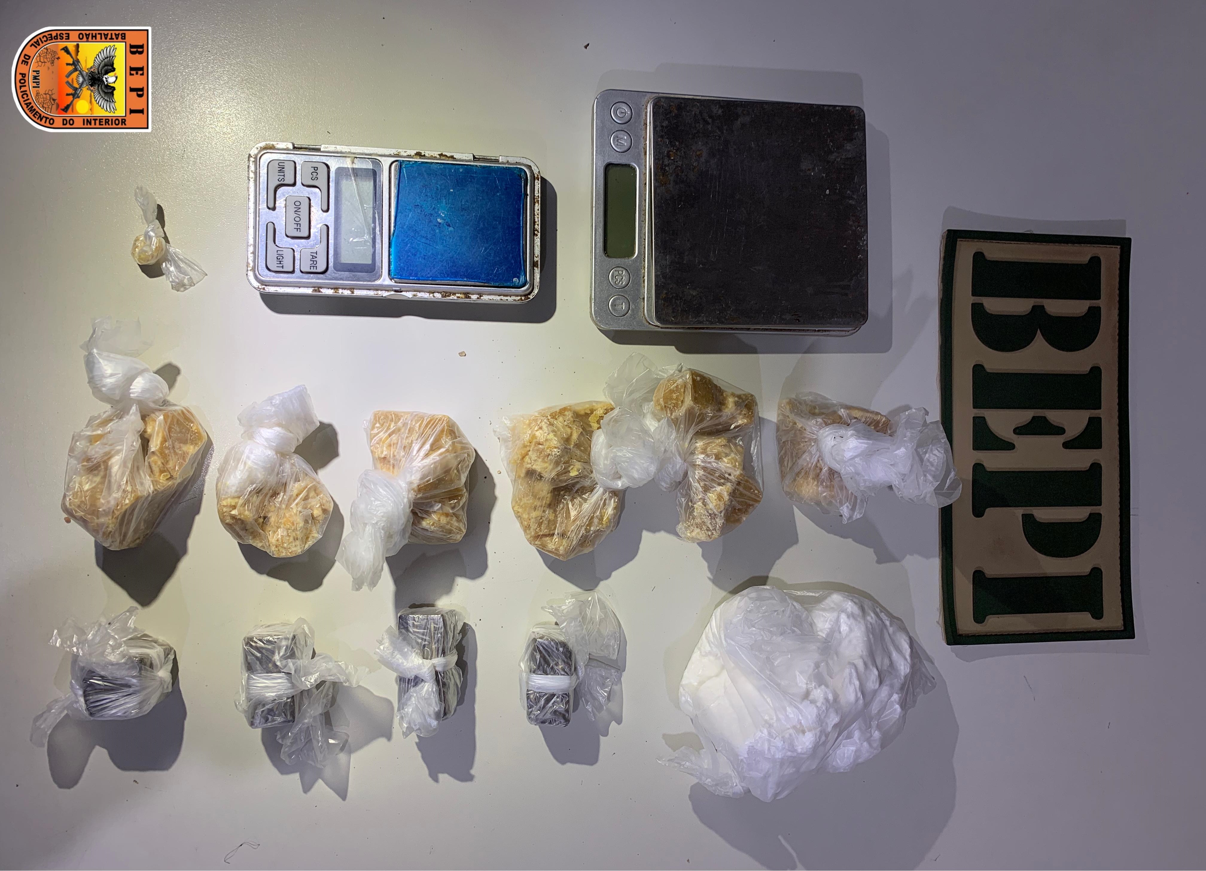 Foram apreendidos sete porções de substancias análogas a crack, uma porção de substancia análoga a cocaína, quatro porções de substancia análoga a maconha, além de uma balança de precisão.