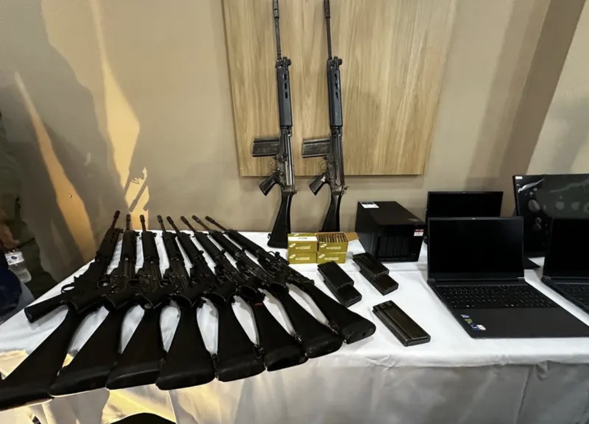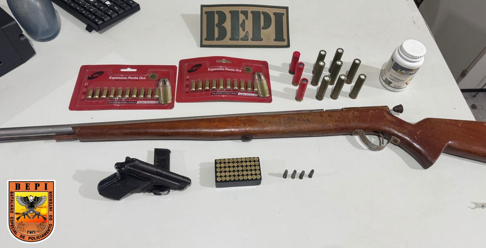 No interior do imóvel, foram localizados uma pistola Beretta calibre 6.35, a espingarda, 20 munições calibre .380, 54 munições calibre .22, 11 munições calibre .32 e dois recipientes contendo chumbo.