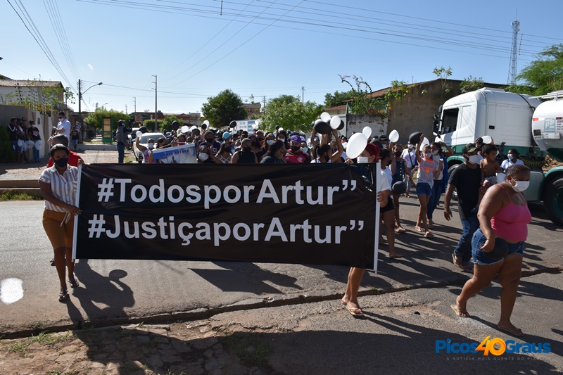 Durante o percurso os manifestantes gritavam “Justiça Por Artur”, seguravam balões brancos e pretos em sinal de luto, além de faixas.