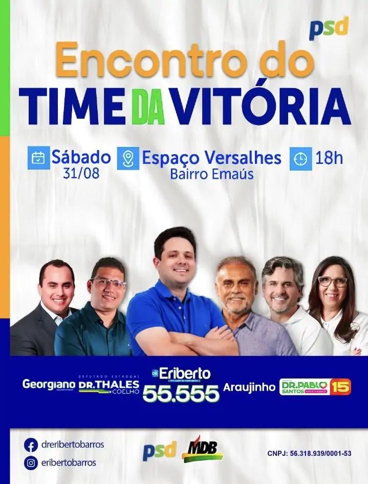 O vereador e atual presidente da Câmara Municipal de Picos, Eriberto Barros (PSD), candidato a reeleição, irá reunir no próximo sábado, 31 de agosto, às 18h no Espaço Versalhes, bairro Emaús, familiares, lideranças políticas locais e estaduais além de amigos e simpatizantes no evento que tem como tema “ Encontro da Vitória “, que visa amplo diálogo com a população além da apresentação de propostas e fortalecimento da campanha eleitoral.