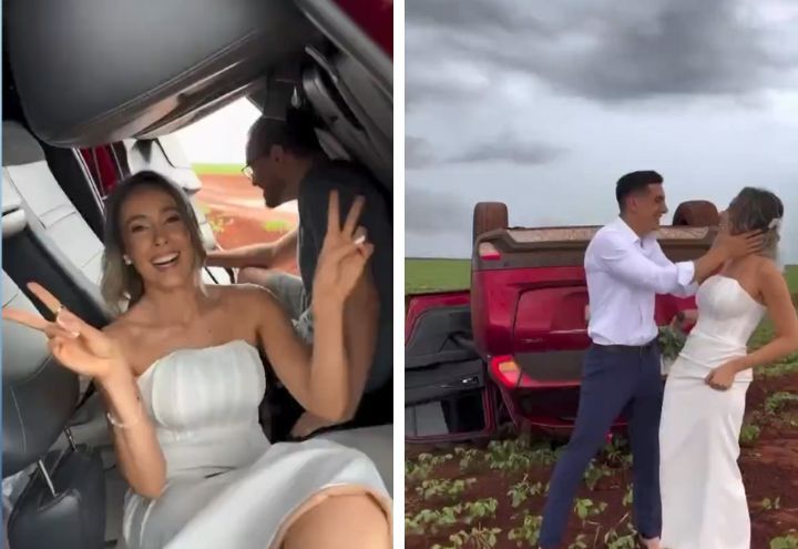 Chovia muito no dia e, quando estavam na estrada de terra, um animal atravessou a pista, perto de uma lavoura de soja. Com a via molhada e lamacenta, o carro “tombou em câmera lenta”. Para a noiva, como ninguém se feriu, o “clima” ficou propício, mesmo com o choque pela situação inusitada e que gerou muitas risadas.