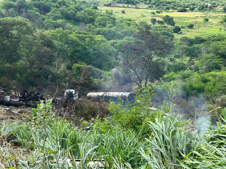 “O caminhão havia capotado em uma ribanceira na lateral da rodovia, há aproximadamente 100 metros da pista. Inicialmente, a equipe foi informada que o condutor estava em óbito ao lado do veículo. A guarnição avaliou o cenário e iniciou o combate ao incêndio com uso de água do ABT. As chamas foram parcialmente combatidas. A PRF estava no local e auxiliou no isolamento da área. Após avaliar o risco, foi constatado que havia perigo de explosão e intoxicação por inalação. Em seguida, a equipe aguardou a diminuição dos riscos locais”, explicou.