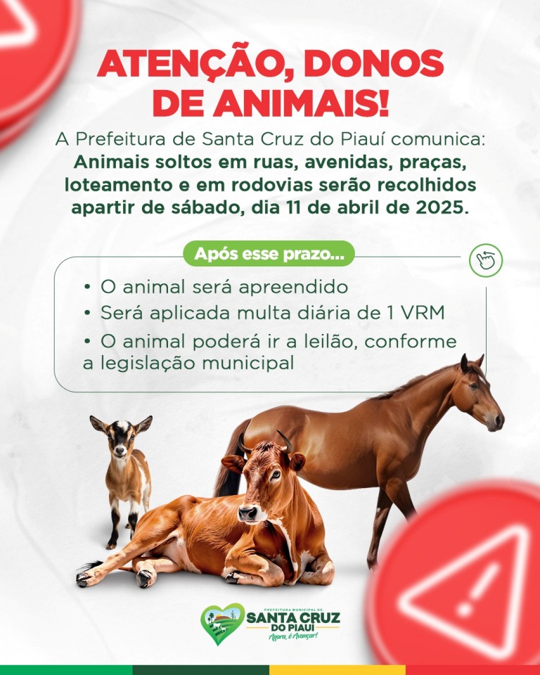A Prefeitura de Santa Cruz do Piauí emitiu um comunicado direcionado aos proprietários de animais, alertando para a necessidade de recolherem os bichos que estiverem soltos em vias públicas até o próximo sábado, 12 de abril de 2025.