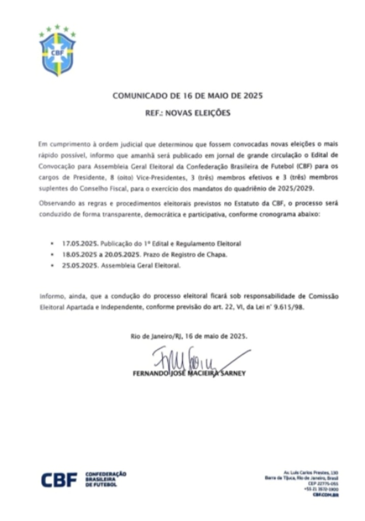 Nomeado responsável pelo processo eleitoral após o afastamento de Ednaldo Rodrigues, na quinta-feira (15), Sarney publicou o documento com a convocação da eleição e informou que o edital será publicado a partir deste sábado (17). O registro das chapas interessadas poderá ser feito entre domingo (18) e terça-feira (20).
