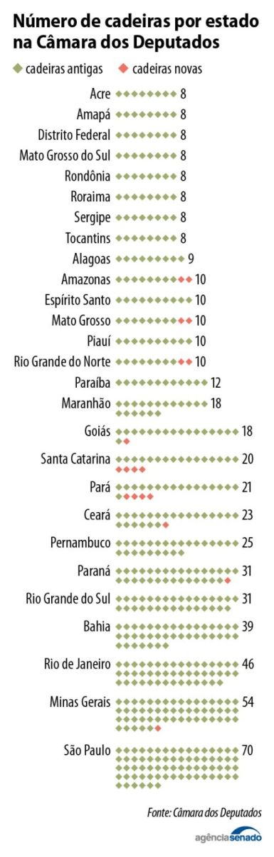 A correção periódica do número de deputados em relação à população de cada estado e do Distrito Federal é um mandamento da Constituição. Ela não fixa número total máximo de deputados, mas determina que uma lei futura regule o assunto. A Constituição também estabelece que nenhuma unidade da federação pode ter menos de 8 representantes e que o estado mais populoso (São Paulo, atualmente) deve ter, no máximo, 70 cadeiras.