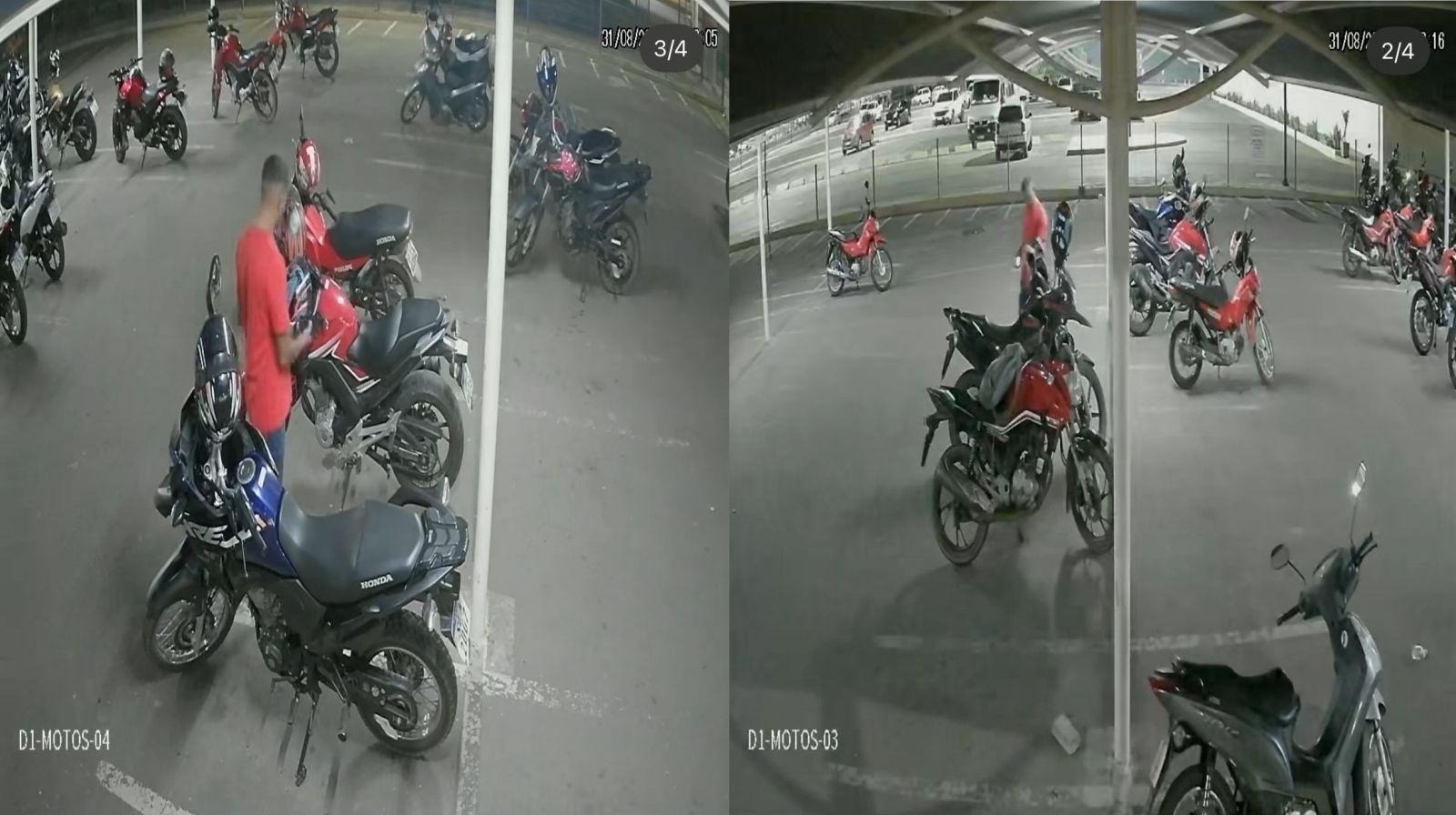 A ação acontece de forma rápida, o homem entra no estacionamento, pega um capacete, anda alguns metros sobe na moto e leva o objeto no braço.