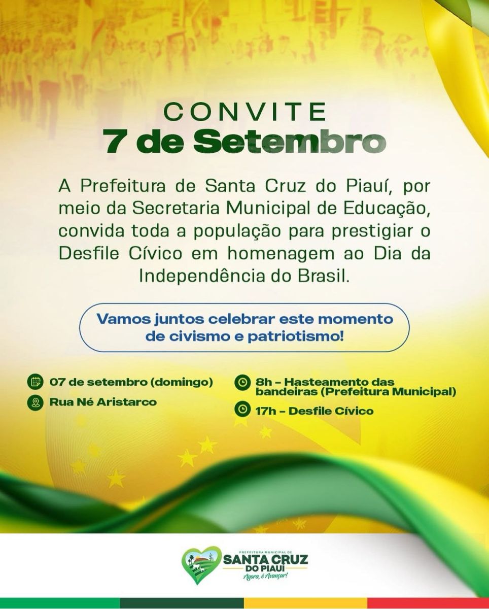 A Prefeitura de Santa Cruz do Piauí, através de suas secretarias e coordenações, está alinhada e realizando os últimos preparativos para o tradicional Desfile Cívico de 7 de Setembro.
