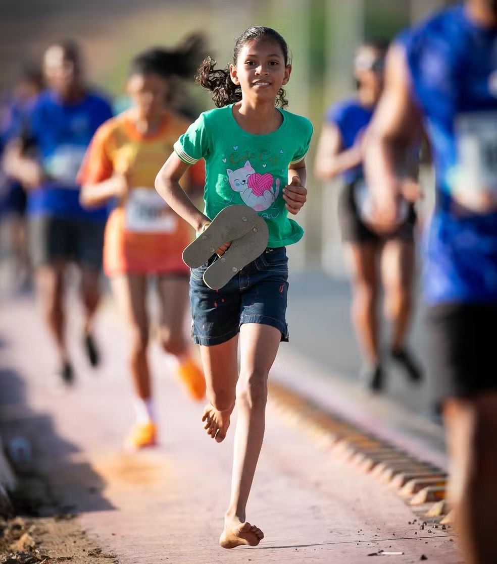 Os sonhos de Jhenyfer Sophie, de apenas 11 anos, caminham pelo meio do esporte. Conhecida como "goleirinha", em Uruçuí, no interior do Piauí, a jovem atleta viralizou nas redes sociais ao completar 6km descalça e com os chinelos nas mãos em uma prova de corrida de rua. O vídeo alcançou mais de 16 mil visualizações até o momento. Assista acima.