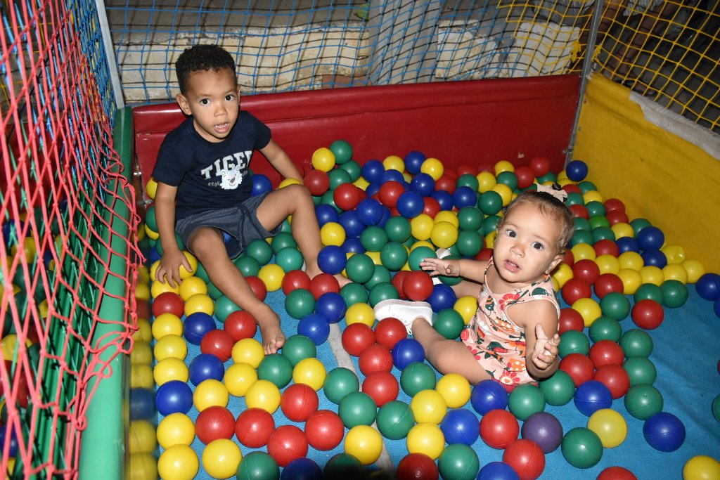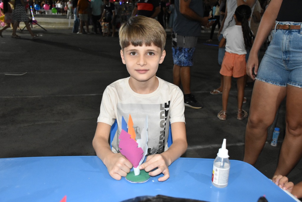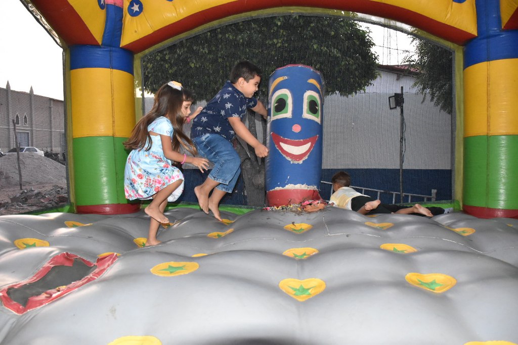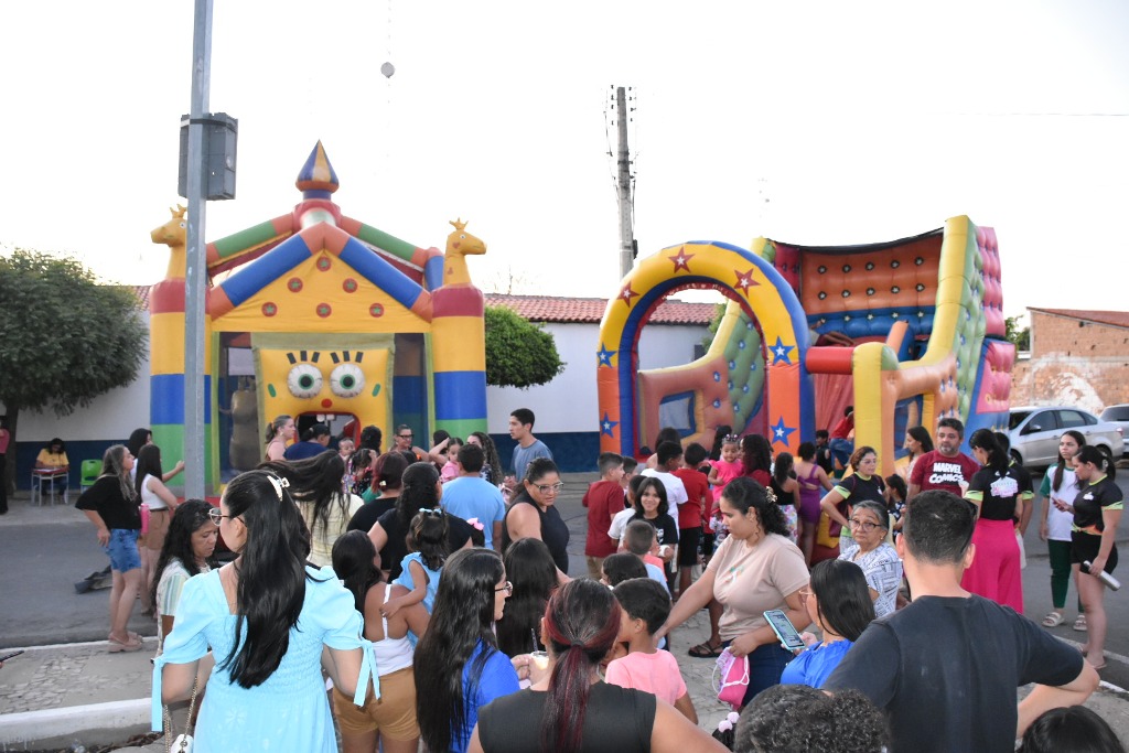 As adjacências da praça se transformaram em um verdadeiro parque de diversões, com brinquedos infláveis, pula-pula e balões coloridos que chamavam a atenção de todos. Além das brincadeiras, houve distribuição de algodão doce, pipoca, cachorro-quente e refrigerante, garantindo a energia da garotada durante toda a programação.