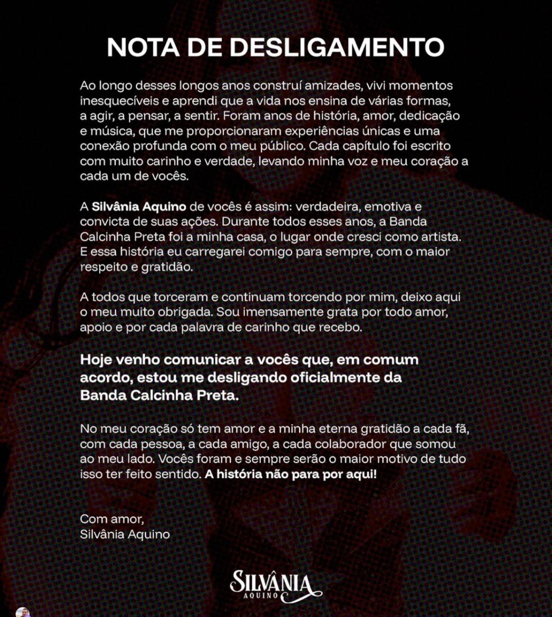 Por fim, Silvânia Aquino, então, revelou seu saída do grupo: "Hoje venho comunicar a vocês que, em comum acordo, estou me desligando oficialmente da Banda Calcinha Preta. No meu coração só tem amor e a minha eterna gratidão a cada fã, com cada pessoa, a cada amigo, a cada colaborador que somou ao meu lado. Vocês foram e sempre serão o maior motivo de tudo isso ter feito sentido. A história não para por aqui!".