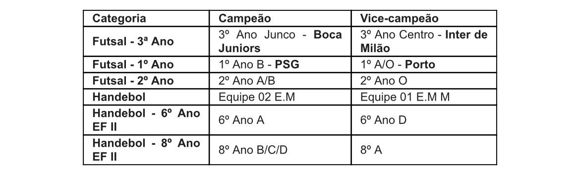 As turmas masculinas competiram na modalidade de Futsal, enquanto as equipes femininas disputaram o Handebol.