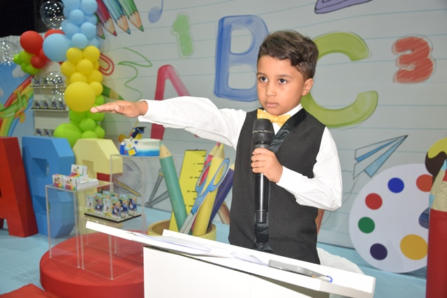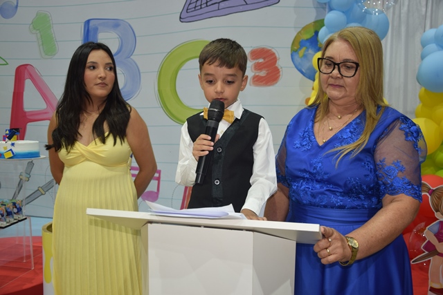 O aluno Túlio Vithor da Silva Nascimento, da U.E. Lagoa do Tucano, conduziu o tradicional Juramento do ABC, seguido pelo discurso do aluno-orador Francisco Pietro Guimarães Dias, da U.E. Nossa Senhora dos Remédios, que emocionou os presentes ao destacar a importância da educação na vida das crianças.