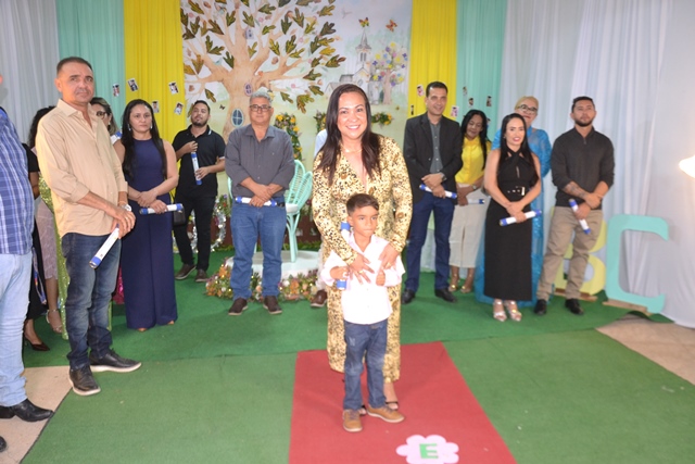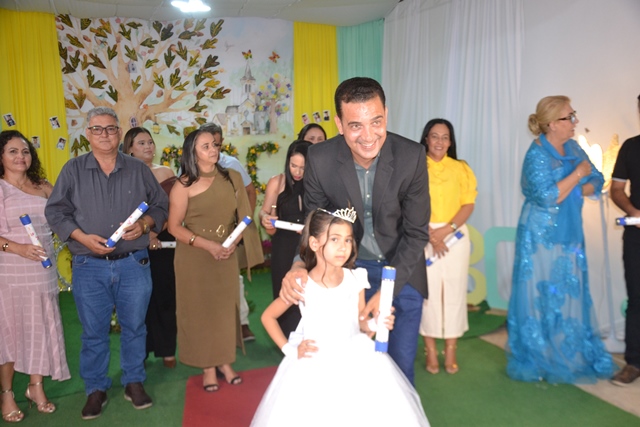 A programação seguiu com os pronunciamentos das autoridades, que destacaram a importância da educação na formação cidadã e o compromisso do município com o fortalecimento do ensino. Um dos momentos mais simbólicos da noite foi a colocação do anel de formatura, representando o cuidado, o amor e o compromisso com o saber que começa a florescer na vida das crianças.