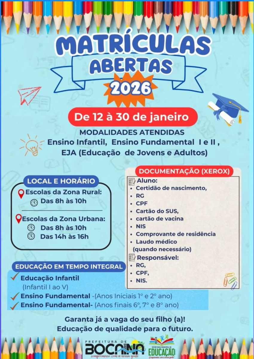 As matrículas serão realizadas no período de 12 a 30 de janeiro, contemplando as modalidades de Educação Infantil, Ensino Fundamental I e II e Educação de Jovens e Adultos (EJA). O processo acontecerá diretamente nas unidades escolares da rede municipal, tanto na zona urbana quanto na zona rural.