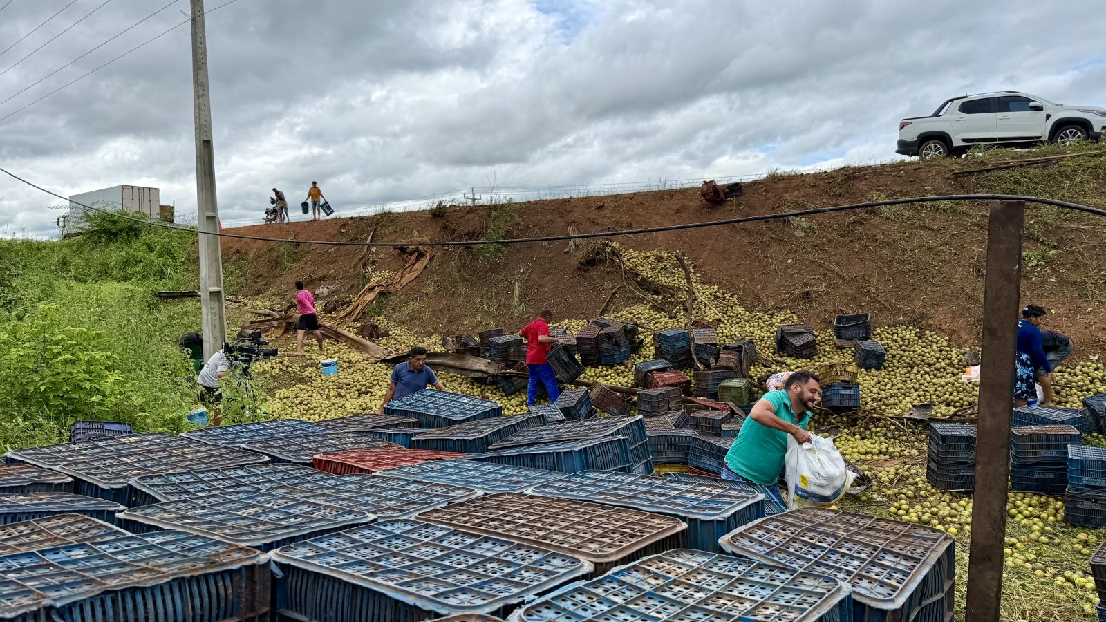 Moradores da região aproveitaram a situação para recolher parte da carga de laranjas que ficou espalhada às margens da rodovia.