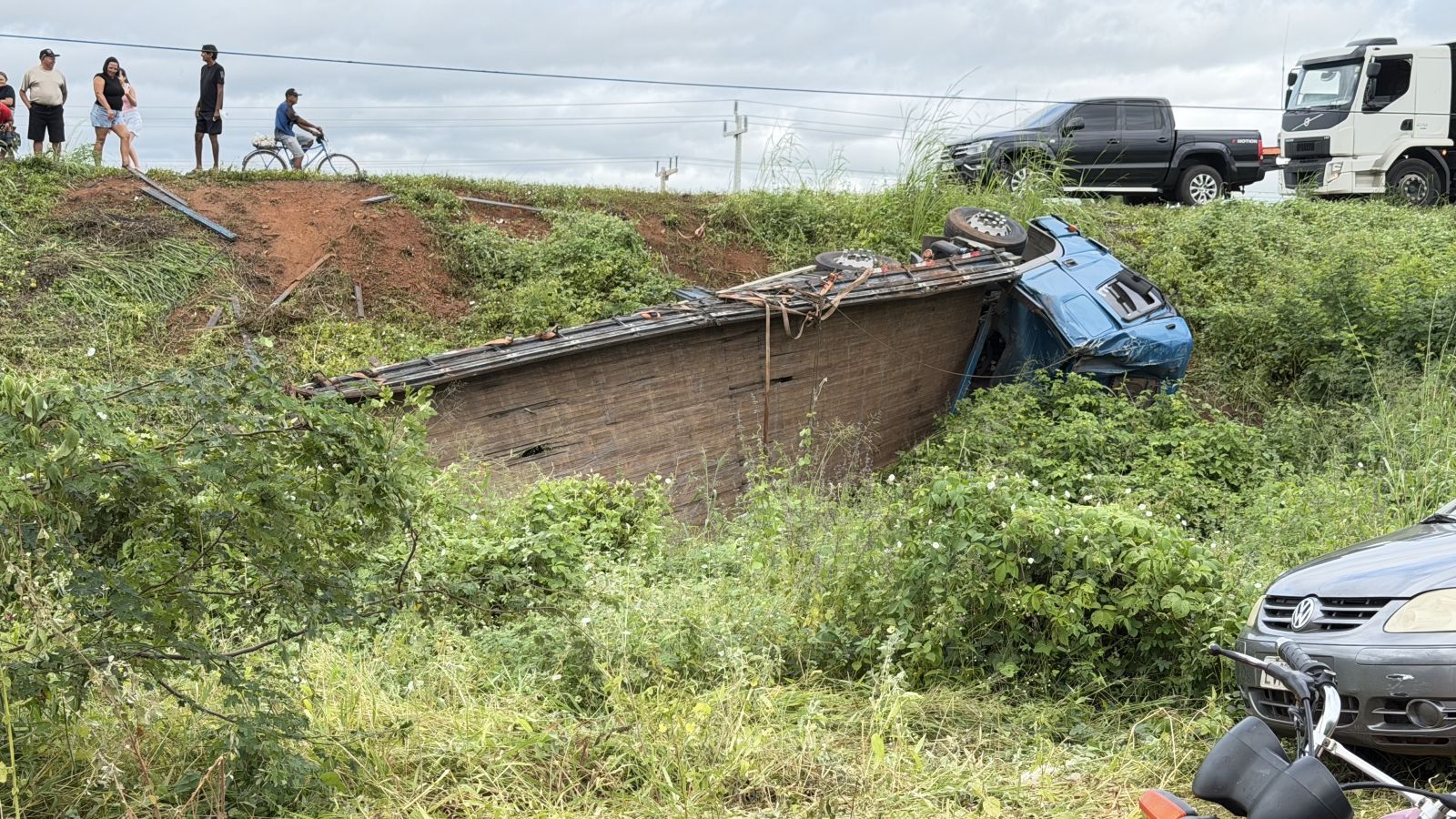 As causas do acidente ainda estão sendo apuradas, mas a suspeita inicial é de que o tombamento tenha relação com excesso de carga ou acondicionamento inadequado. O estado de saúde da vítima não foi oficialmente divulgado até o momento.