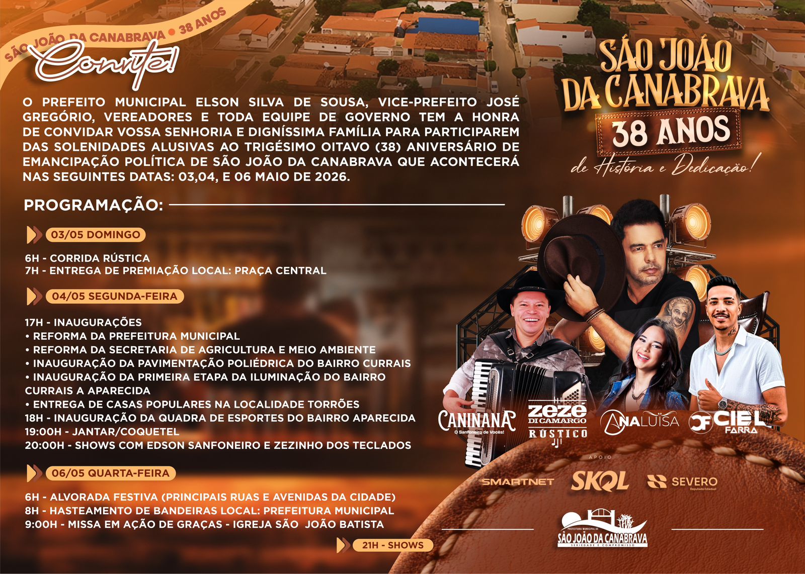 A Prefeitura de São João da Canabrava, sob a gestão do prefeito Elson Silva, divulgou nesta quarta-feira, 15 de abril a programação oficial em comemoração aos 38 anos de emancipação política do município. As atividades acontecerão entre os dias 3 e 6 de maio de 2026, reunindo eventos esportivos, inaugurações, celebrações religiosas e grandes atrações musicais.