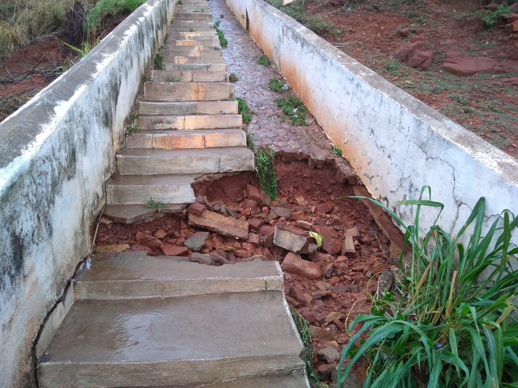 Ainda no bairro São José, parte da escadaria que dá acesso ao bairro Morada do Sol, na Rua Elizeu Nunes, foi destruída.
