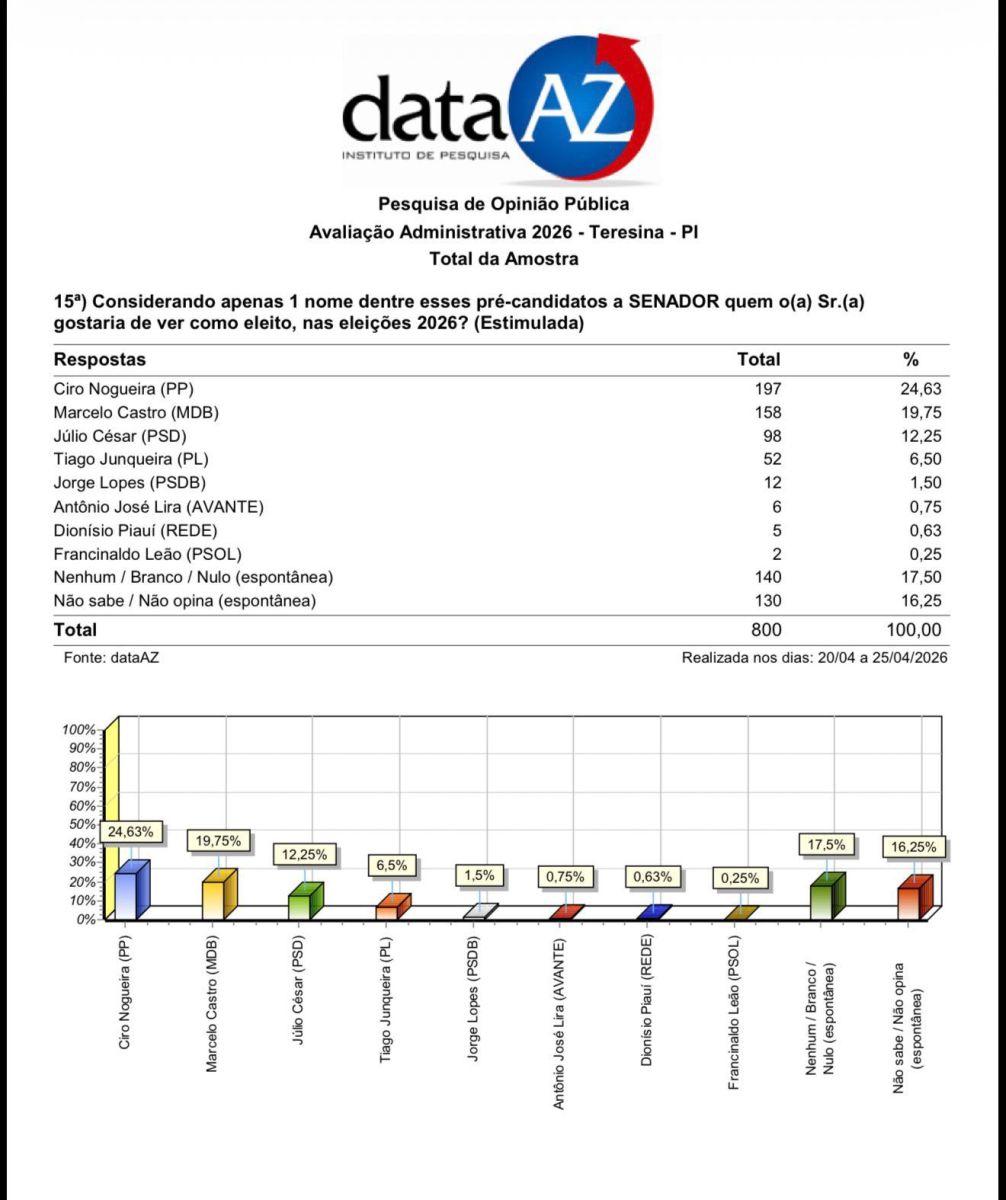 Em segundo lugar apareceu o senador Marcelo Castro (MDB) com 19,74% das intenções de votos. Mais atrás está o deputado federal Júlio César (PSD) com 12,25%.