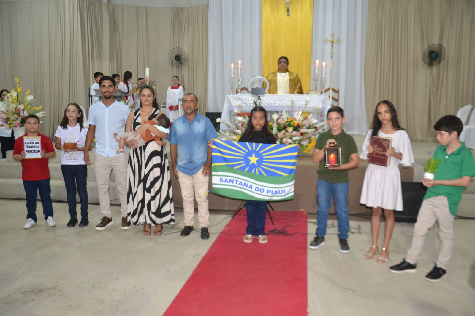 Durante a celebração, um dos momentos mais simbólicos foi a apresentação de elementos que representam a história e a identidade de Santana do Piauí. Entre eles, a imagem de São Pedro, padroeiro da cidade, e a Bandeira Municipal, reforçando o sentimento de pertencimento e devoção do povo santanense.