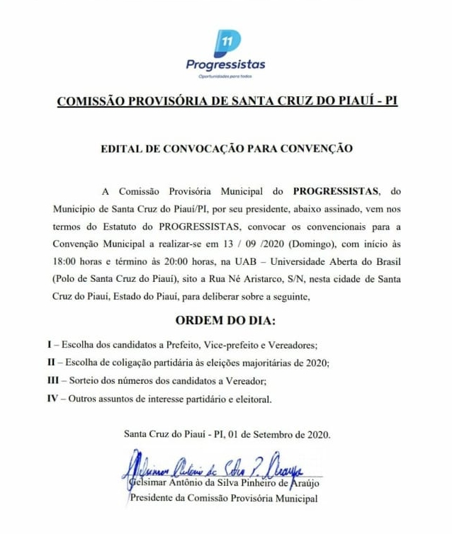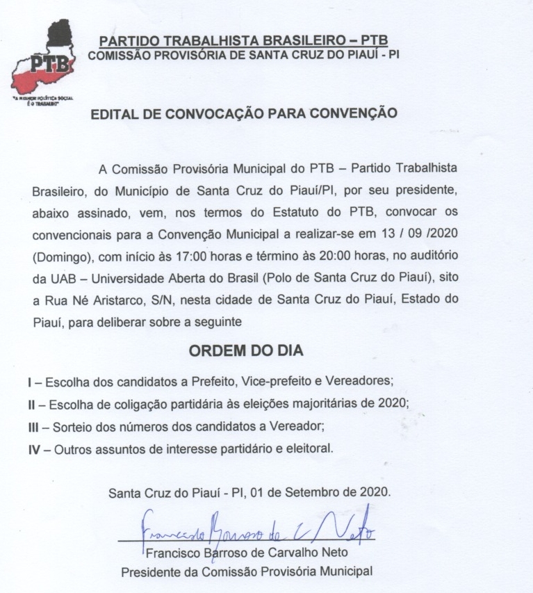 O Partido Trabalhista Brasileiro (PTB), assim como Partido Progressista do município de Santa Cruz do Piauí, irão realizar no dia 13 setembro, a sua convenção para definição de candidaturas majoritárias e proporcionais com vistas ao pleito do dia 15 de novembro deste ano.