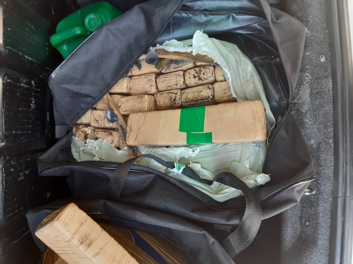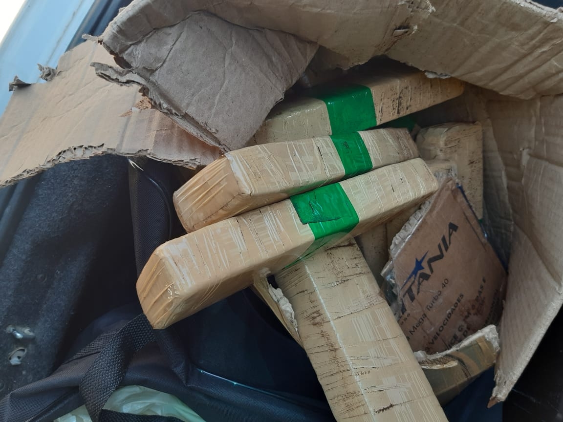 Ao ser inspecionado o veículo que utilizavam, um Fiat Punto, sem placa dianteira, foi verificado em seu interior duas bagagens com diversos tabletes de maconha, com um total de aproximadamente 60 quilos.