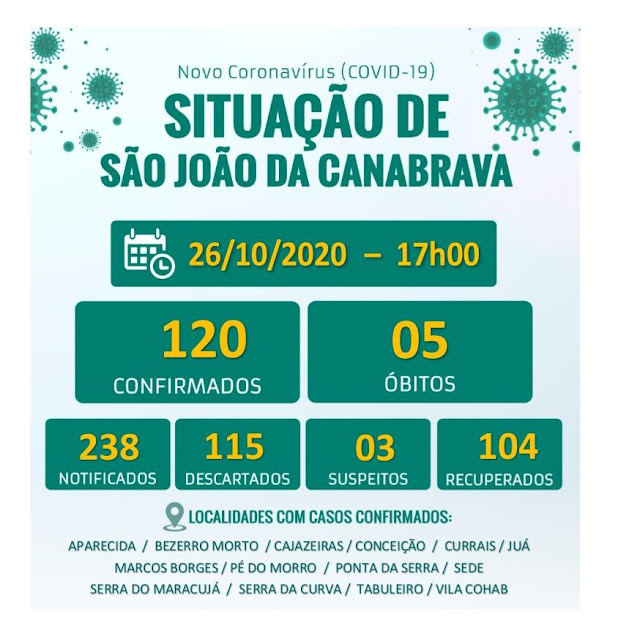 Subiu para 120 o número de casos positivos do novo coronavírus em São João da Canabrava. Os números foram atualizados nesta segunda-feira, 26, pela Secretaria Municipal de Saúde e revelam que o vírus permanece circulando na cidade. Ao todo, 16 pessoas estão sendo monitoradas e três casos suspeitos aguardam resultado de exame.