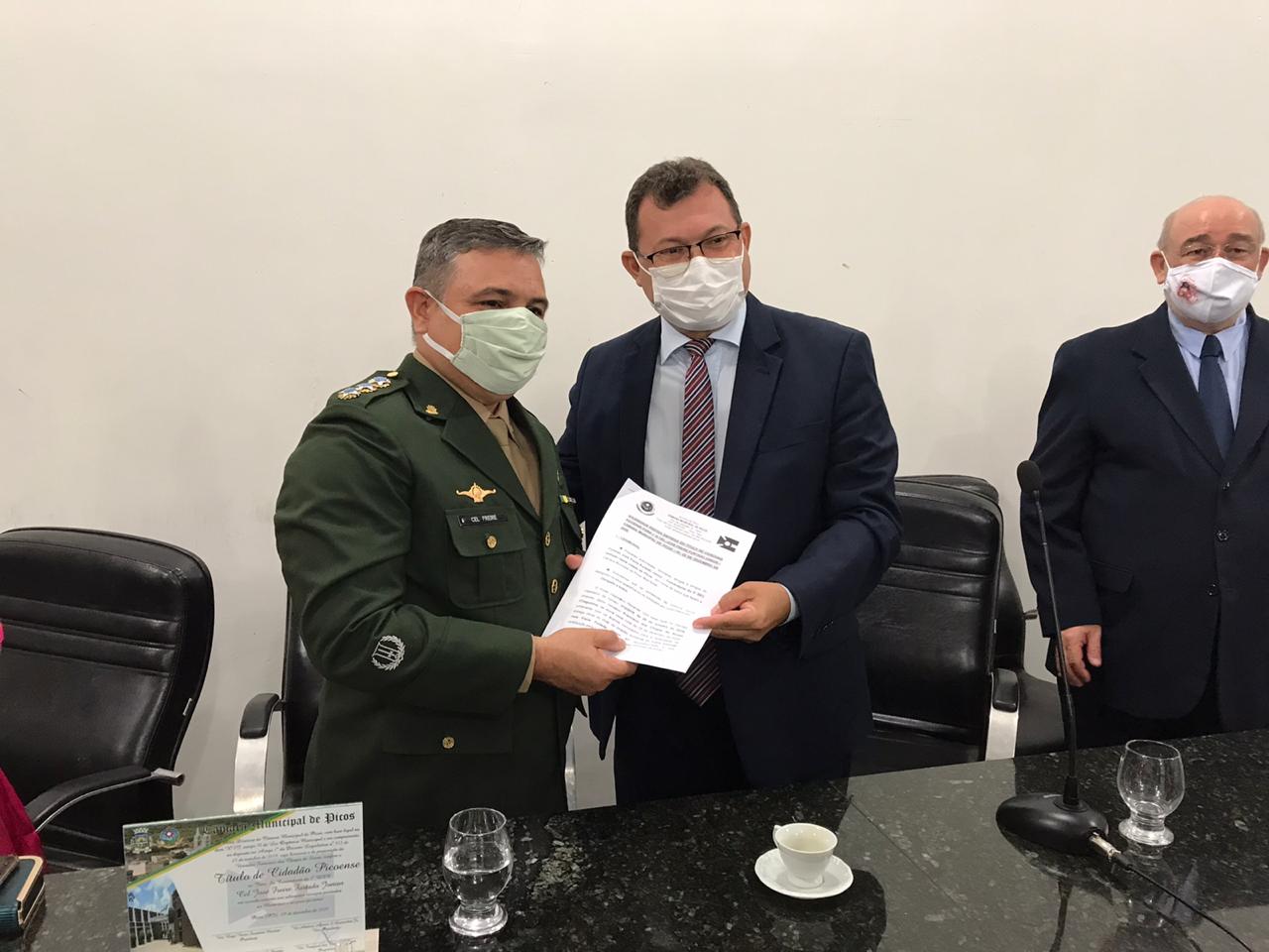 A Câmara de Vereadores de Picos realizou na noite desta quarta-feira, 09 de dezembro, sessão solene de entrega de título de cidadania ao comandante do 3º Batalhão de Engenharia e construção (3º BEC), coronel José Freire Furtado Júnior.