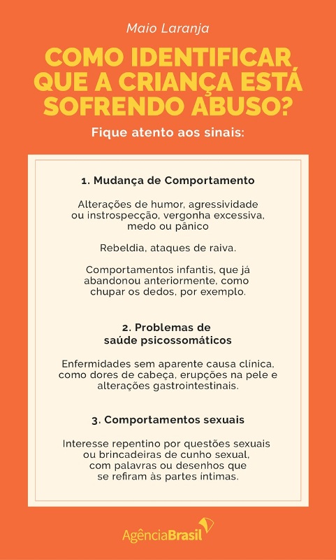 A iniciativa é uma das ações do Maio Laranja, criado exatamente para incentivar a realização de atividades que possam conscientizar, prevenir, orientar e combater o abuso e a exploração sexual de crianças e adolescentes durante todo o mês de maio. Como parte das ações programadas, ontem (17) o governo lançou o Programa Nacional de Enfrentamento à Violência Contra Crianças e Adolescentes.