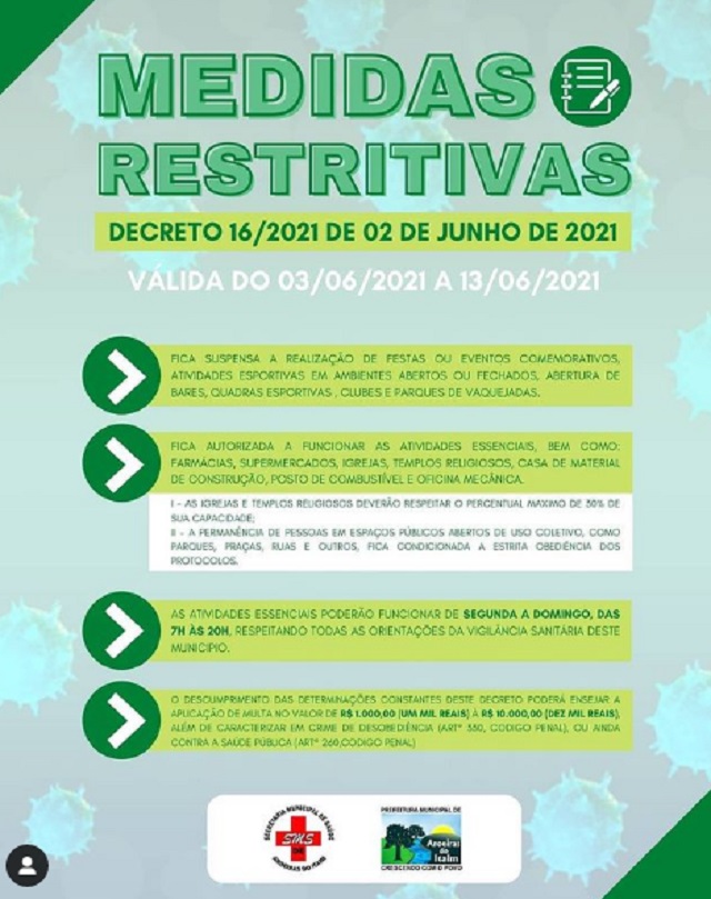 Durante a vigência do Decreto ficam suspensas em todo área do município aroeirense a realização de festas ou eventos comemorativos da iniciativa pública ou privada, a prática de atividades esportivas em ambientes abertos ou fechados, a abertura de bares, quadras esportivas, clubes parques de vaquejada.