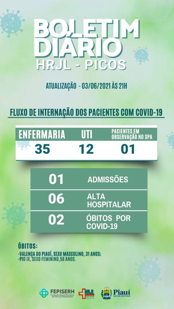 O Hospital Regional Justino Luz (HRJL) divulgou novo boletim na noite de quinta-feira, 03 de junho de 2021. Pela última atualização, o número de pacientes na UTI Covid se manteve estável em comparação ao dia anterior.