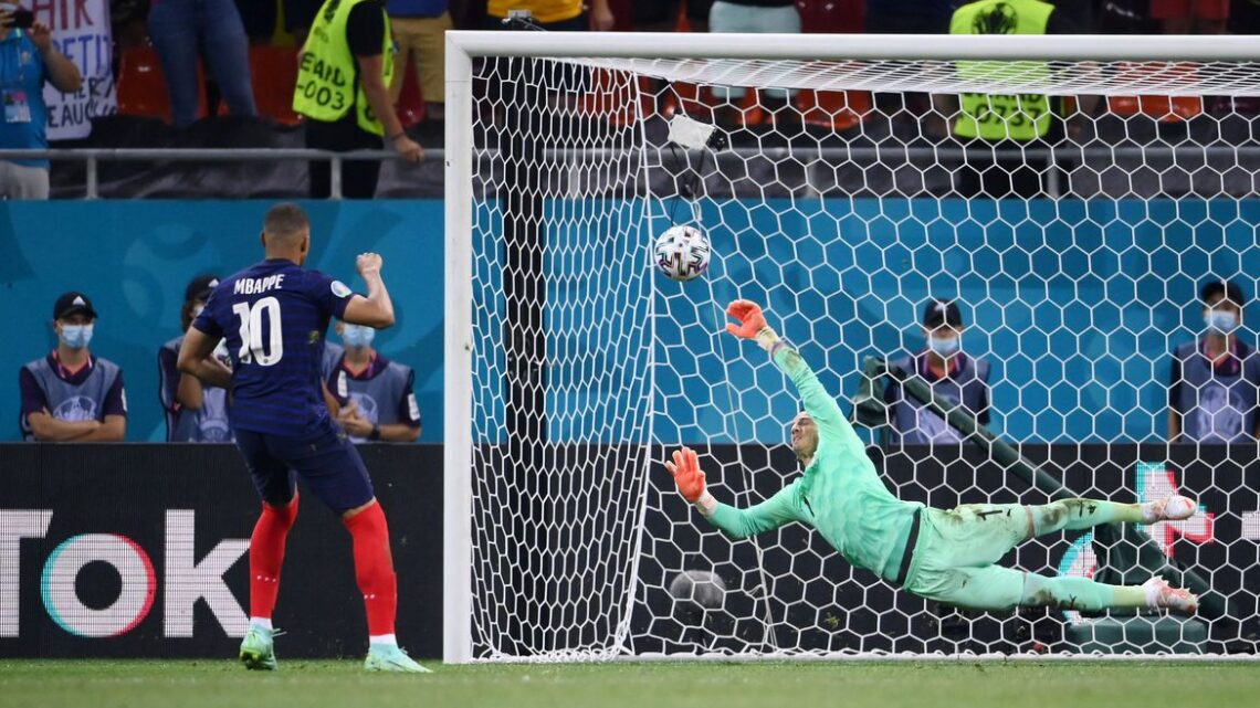 Na disputa por pênaltis, todos haviam convertido até chegar a vez de Mbappé. A Suíça marcou os cinco pênaltis e, quando o atacante do PSG chutou para a direita, Sommer e defendeu de mão trocada.