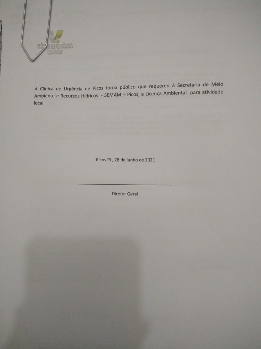 A Clínica de Urgência de Picos torna público o requerimento encaminhado à Secretaria Municipal de Meio Ambiente e Serviços Hídricos (SEMAM – Picos) solicitando a licença ambiental para a atividade local. De acordo com às informações do documento, fica determinado que haverá um estudo do impacto ambiental para a concessão da licença.