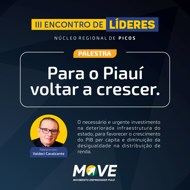 A cidade de Picos recebe nesta sexta-feira (22/10) às 19h no Auditório do Senac Antônio Rodrigues dos Santos o III Encontro de Líderes do Movimento Empreender Piauí (MOVE).