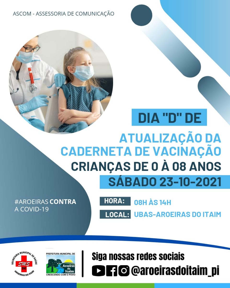 Neste sábado, 23 de outubro, a Secretaria Municipal de Saúde de Aroeiras do Itaim, realizará o dia "D" de atualização da caderneta de vacinação.