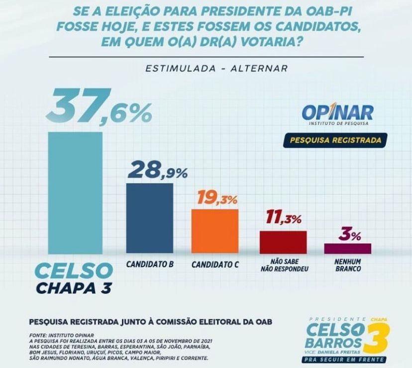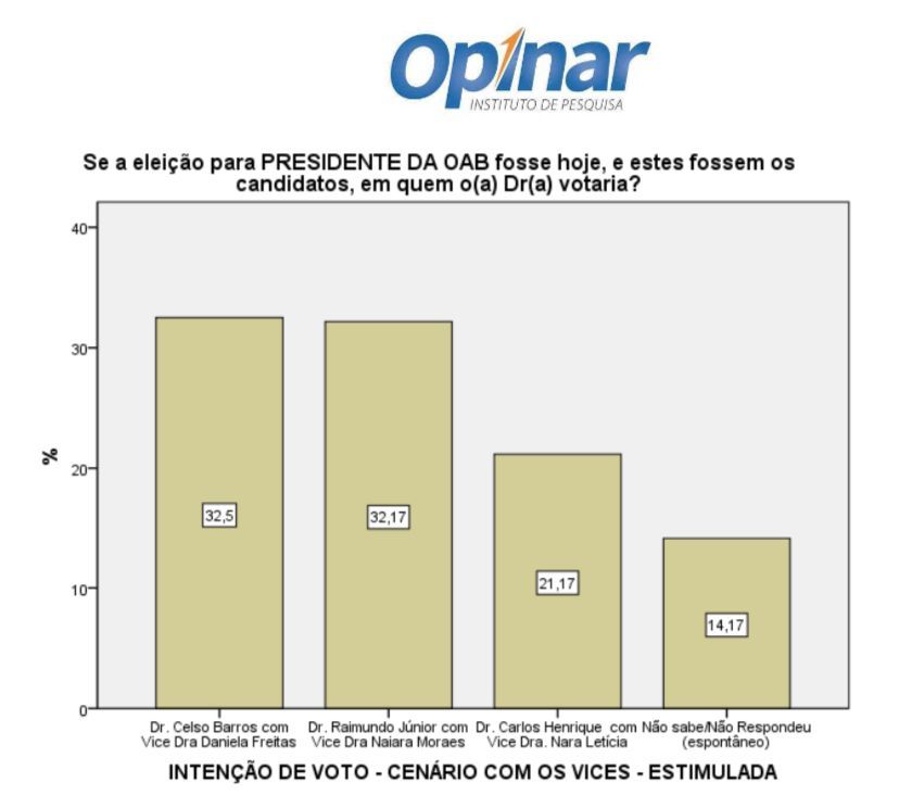 Uma nova pesquisa do Instituto Opinar para as eleições da OAB-PI mostra queda de Celso Neto, de 37,6% para 32,50%, e crescimento de Raimundo Júnior, que sai de 28,9% para 32,17%, estando os dois candidatos empatados na reta final da disputa. Celso Neto também aparece com maior rejeição na nova pesquisa.