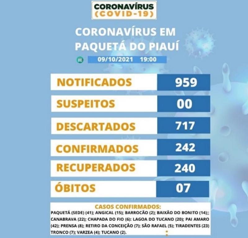 A Prefeitura Municipal de Paquetá do Piauí, através da Secretaria Municipal de Saúde, vem a público com transparência e ética, informar que foi registrado na sexta-feira (10), o oitavo óbito em decorrência da COVID-19.