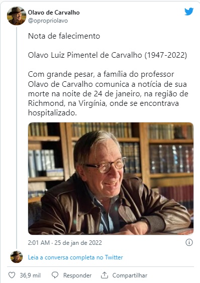 “Com grande pesar, a família do professor Olavo de Carvalho comunica a notícia de sua morte na noite de 24 de janeiro, na região de Richmond, na Virgínia, onde se encontrava hospitalizado”, diz a nota.