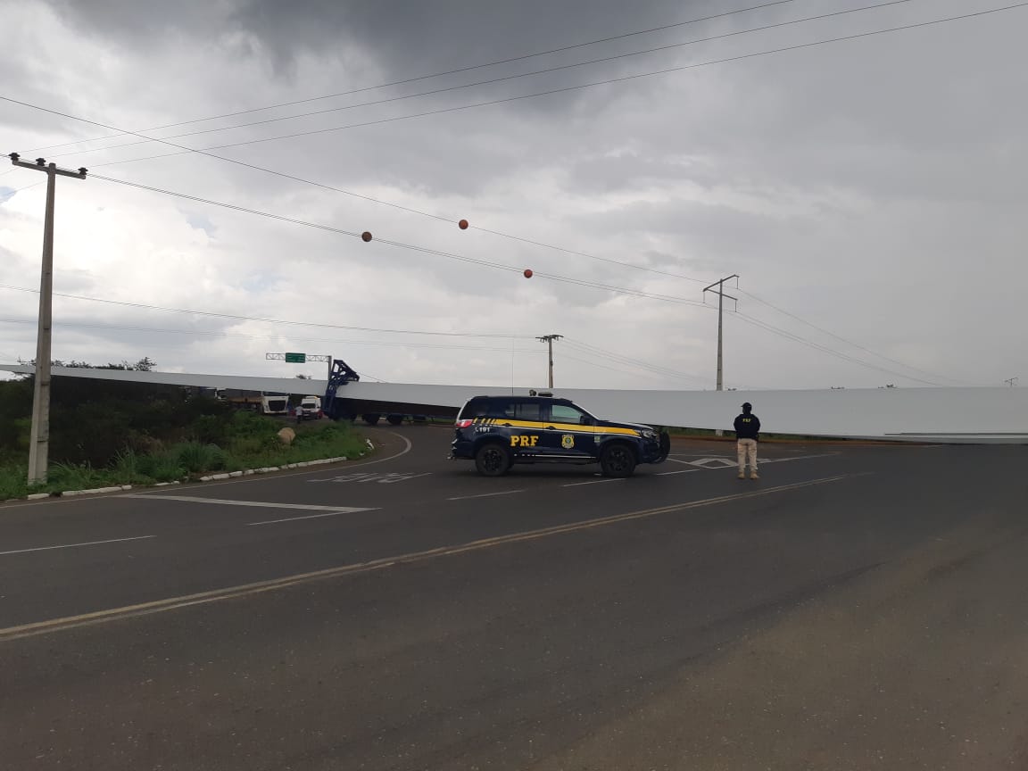 O veículo, que transportava uma pá eólica, tombou ao tentar realizar uma manobra de conversão na BR 020. O evento interditou totalmente a rodovia e não há previsão de liberação. Empresa responsável pelo transporte da carga já acionada.