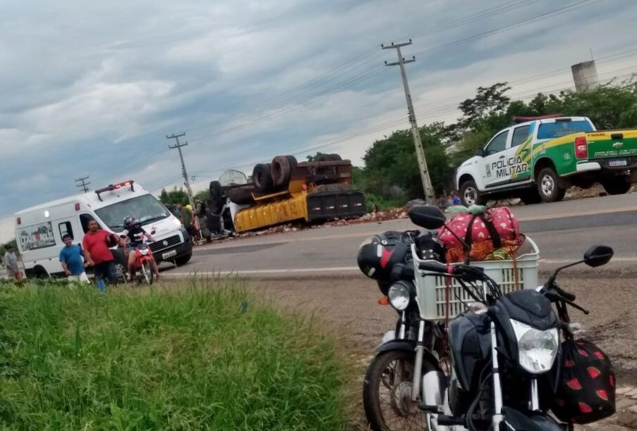 Segundo a Polícia Rodoviária Federal, o veículo estava carregado de paralelepípedos [pedras de calçamento], seguia sentido Picos-Geminiano e capotou próximo ao Mandacaru Motel, ficando com os pneus para cima.