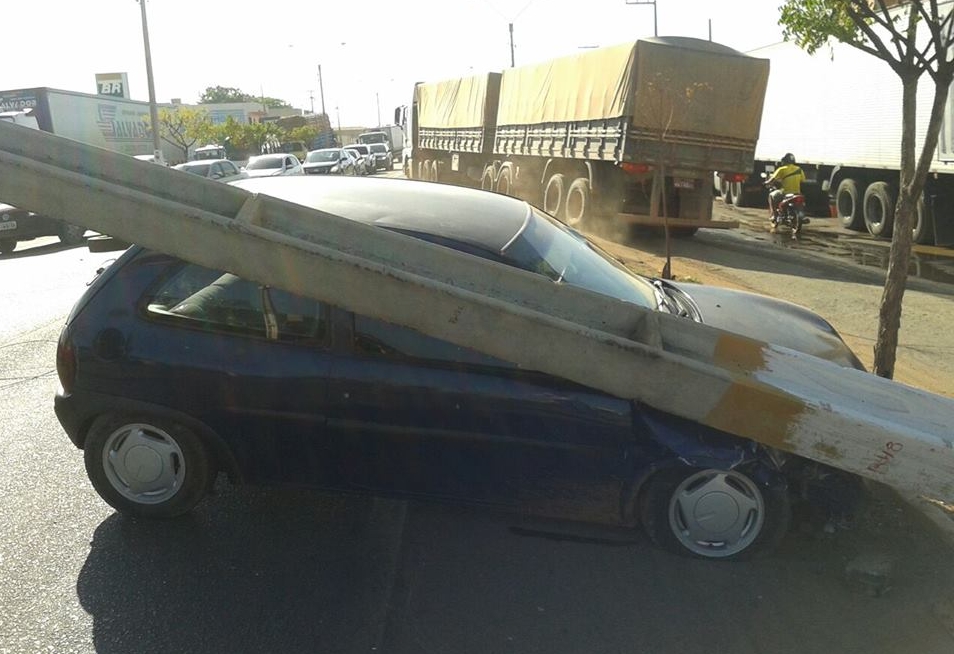 Com a colisão o poste caiu sobre o veículo, mas o motorista teve apenas ferimentos leves.
