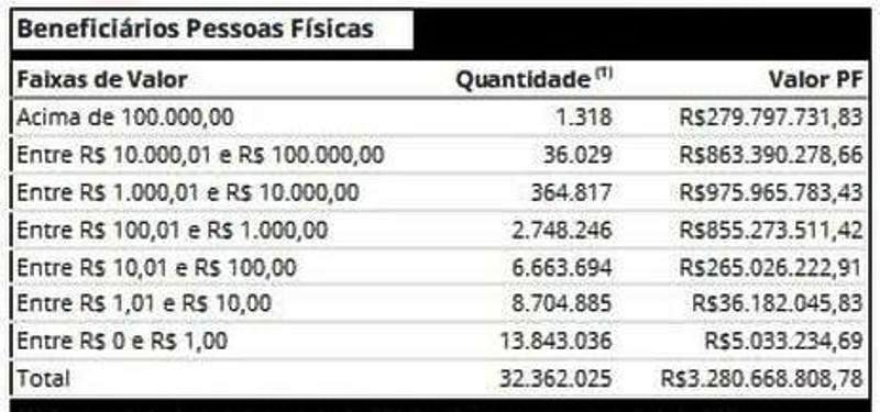Como há casos em que um mesmo CPF tem mais de um valor a receber, foram realizadas 32,4 milhões de transações. Desse total, as transações de até R$ 1 representaram 13,8 milhões das liberações. Os valores entre R$ 1 e R$ 10 corresponderam a 8,7 milhões de casos.
