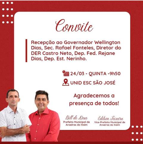A partir de 09h50min, a comitiva do Governo do Estado estará no município de Aroeiras do Itaim onde o Governador será recepcionado pelo Prefeito, Bill de Deus (PTB), do Vice-Prefeito, Edilson Teixeira (PT), e de lideranças políticas.