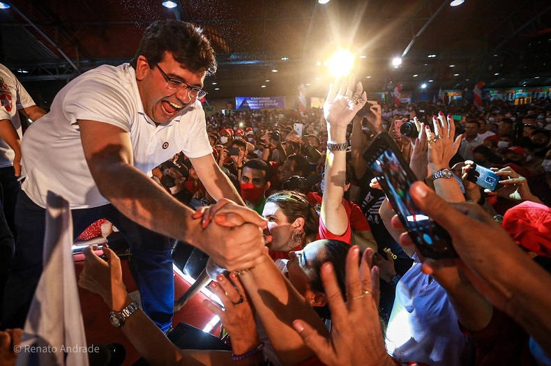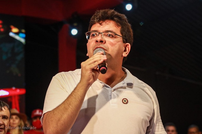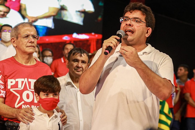 Rafael Fonteles iniciou o discurso ao lado do filho e do pai Nazareno Fonteles e da governadora Regina Sousa (PT). Para ele, o governo Bolsonaro é “desastre econômico”.