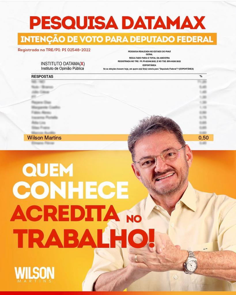 Em pesquisa divulgada ontem, segunda-feira, 06, a menos de 4 meses da eleição, o ex-governador Wilson Martins aparece como 8º colocado na classificação geral e, mais importante ainda, em 2º lugar dentre os que disputam uma vaga na Câmara Federal pela Federação formada pelos partidos PT, PCdoB e PV, atrás apenas de Rejane Dias, ex-primeira-dama do Estado.