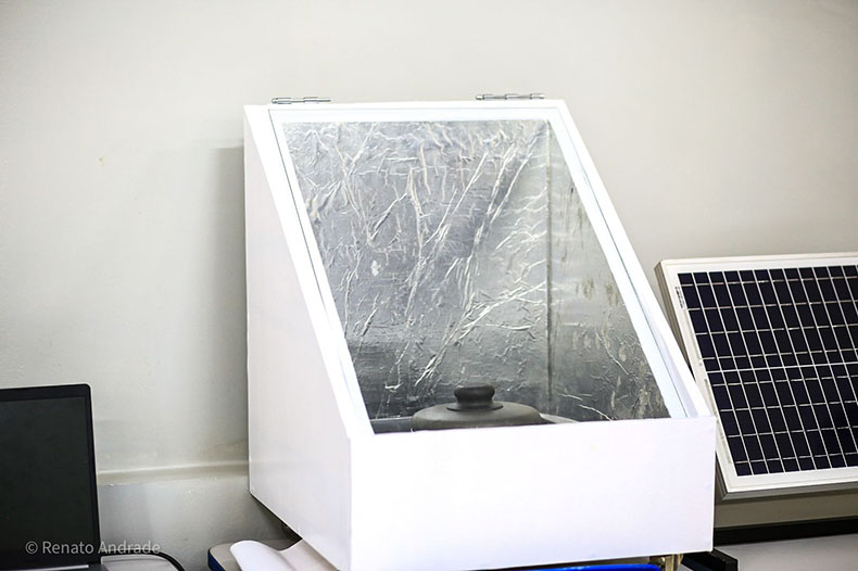 “”Basicamente, o funcionamento dele consiste na captação de raios solares. Esses raios solares refletem para dentro da panela e esse alimento é acelerado através do efeito estufa, causado por conta do vidro”, explicou Riquelme Santos.