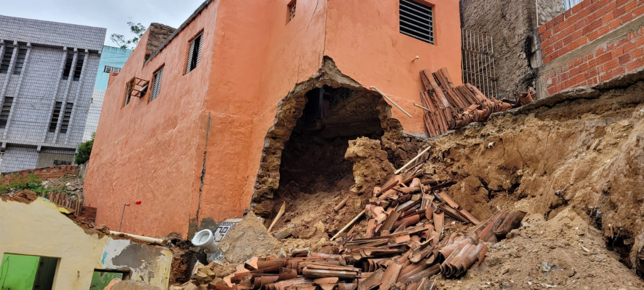 Parte da parede de uma casa desabou sobre o telhado de outra no Centro de Picos, na última quarta-feira (20). Não havia pessoas nas casas e ninguém ficou ferido.