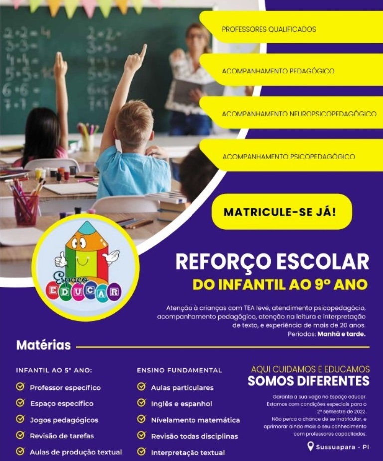 Foi inaugurado nesta sexta-feira (29), na cidade de Sussuapara, região de Picos, o Espaço Educar, que tem como objetivo primordial contribuir na melhoria da aprendizagem de crianças com necessidades específicas e ainda de alunos que necessitem de reforço escolar por meio de aulas particulares.